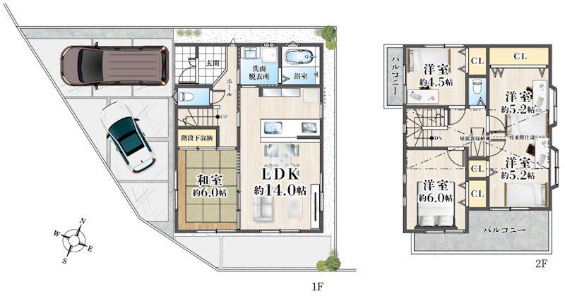 | 間取内容 | LDK14.0畳 1階 1室 和室6.0畳 1階 1室 洋室6.0畳 2階 1室 洋室10.4畳 2階 1室 洋室4.5畳 2階 1室 |