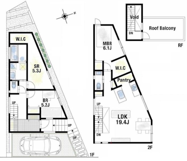 | 間取内容 | 洋室5.2畳 1階 1室 その他5.3畳 1階 1室 洋室6.1畳 2階 1室 LDK19.4畳 2階 1室 +WIC2か所+パントリー |